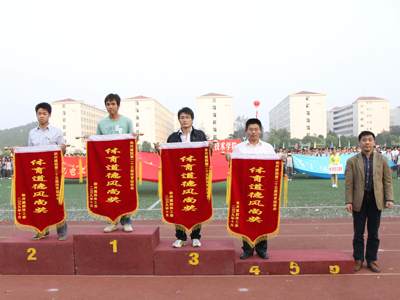 袁洪志院长为获奖系(院)代表颁奖——学生男子团体第一名被土木学院夺得,女子团体第一名被经管系夺得,土木学院摘取了学生团体的桂冠。