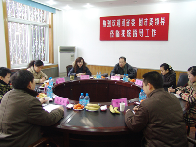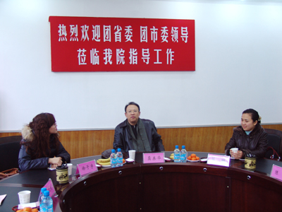 1月14日上午,团省委志工部龚亲华部长一行在团市委副书记苗琳、学校部部长徐子宇的陪同下莅临我院指导共青团工作。学院副院长张登宏、院团委书记梁惠、副书记李大勇等参加了汇报会。张登宏对团省委、团市委领导的到来表示热烈欢迎,并简要介绍了我院办学情况。梁惠汇报了我院共青团工作以及志愿者开展活动的情况。