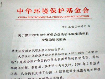 大学生环保公益活动小额资助项目是中华环境保护基金会面对全国高校学生社团开展的资助项目,得到环境保护部、教育部、共青团中央的支持。2007年3月启动以来,已分两批资助了全国32所高校学生社团开展的环保公益活动,取得了良好的社会效果。