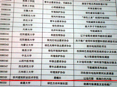 今年6月启动了第三批项目资助,主题是“节能减排从我做起”。在全国各省级环境保护局和各高校团委的支持推荐下,全国共有31个省(自治区、直辖市)168所高校的207个项目申请。经过专家评审,最终资助了来自全国44所高校的50个申请项目。在受资助的50个项目中仅有两个来自高职院校,其它均来自本科院校。