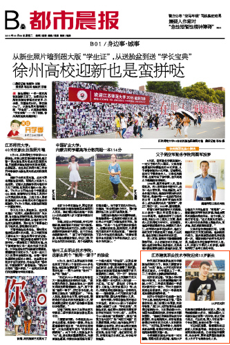 9月8日的《都市晨报》以《江苏建筑职业技术学院迎来15岁新生》为标题,报道了建筑工程管理专业的“00”后新生刘阳和设备学院双胞胎刘凯、刘旋的故事。