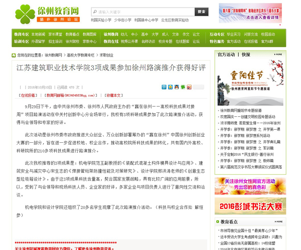 9月29日下午,由中共徐州市委、徐州市人民政府主办的“赢在徐州——高校科技成果对接周”项目路演活动在中关村创新中心分会场举行,江苏建筑职业技术学院有3项科研成果参加了此次路演推介活动,获得与会领导和专家的好评。