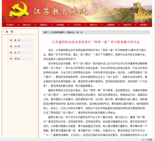 近日,江苏建筑职业技术学院党委领导班子举行“两学一做”学习教育第3次集中学习研讨会,围绕“学习系列讲话,强化‘四个意识’”进行了专题研讨。党委书记吴光林主持研讨会,学校党委中心组成员参加学习。