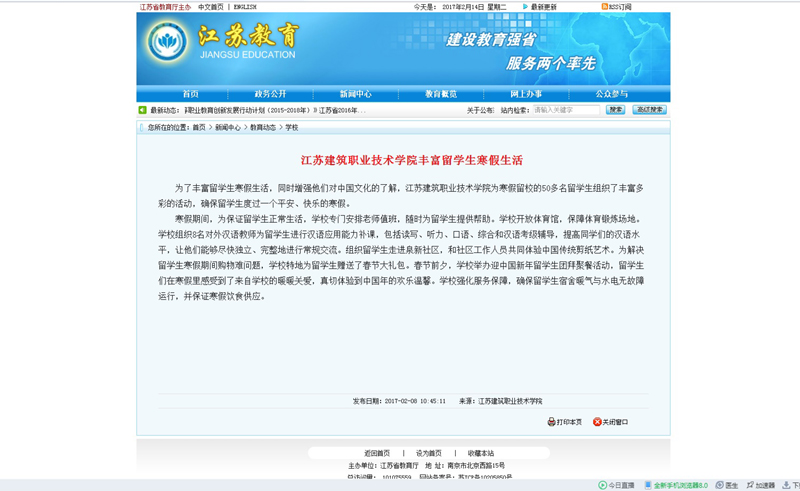 为了丰富留学生寒假生活,同时增强他们对中国文化的了解,江苏建筑职业技术学院为寒假留校的50多名留学生组织了丰富多彩的活动,确保留学生度过一个平安、快乐的寒假。