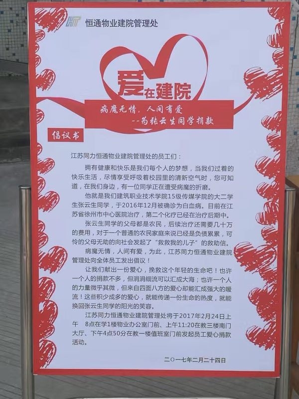 张云生家在徐州睢宁县,父母都是地地道道的农民,且家庭贫寒,被江苏省确定为“贫困建档立卡”的扶持对象。张云生生病对这个本就贫寒的家庭来说,无疑是雪上加霜。学校的老师在得知此事之后,积极帮他想办法,在2月20日,通过网络开始帮他转发轻松筹来筹款,就在这条消息转发出去,短短的2天时间,江苏建院的师生、校友等几乎所有认识和不认识的人都为他慷慨解囊并且进行转发,所有的人都在为他传递着这份感动和关怀,轻松筹的善款增长到7万多元。老师的学生、朋友、全国各地的校友、学校的食堂、幼儿园、物业等等都向他伸出了援助之手,纷纷为他捐款。这份感动,在建院师生中持续发酵。