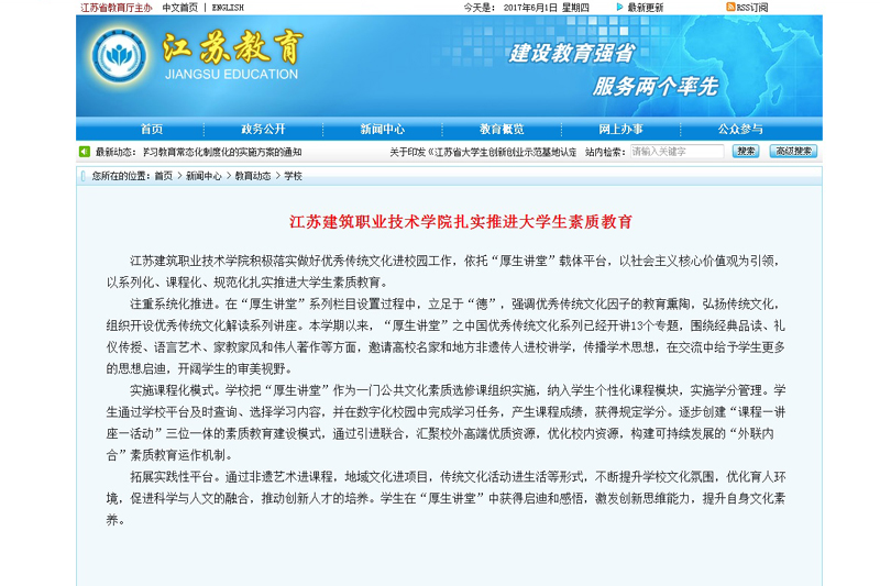 江苏建筑职业技术学院积极落实做好优秀传统文化进校园工作,依托“厚生讲堂”载体平台,以社会主义核心价值观为引领,以系列化、课程化、规范化扎实推进大学生素质教育。
