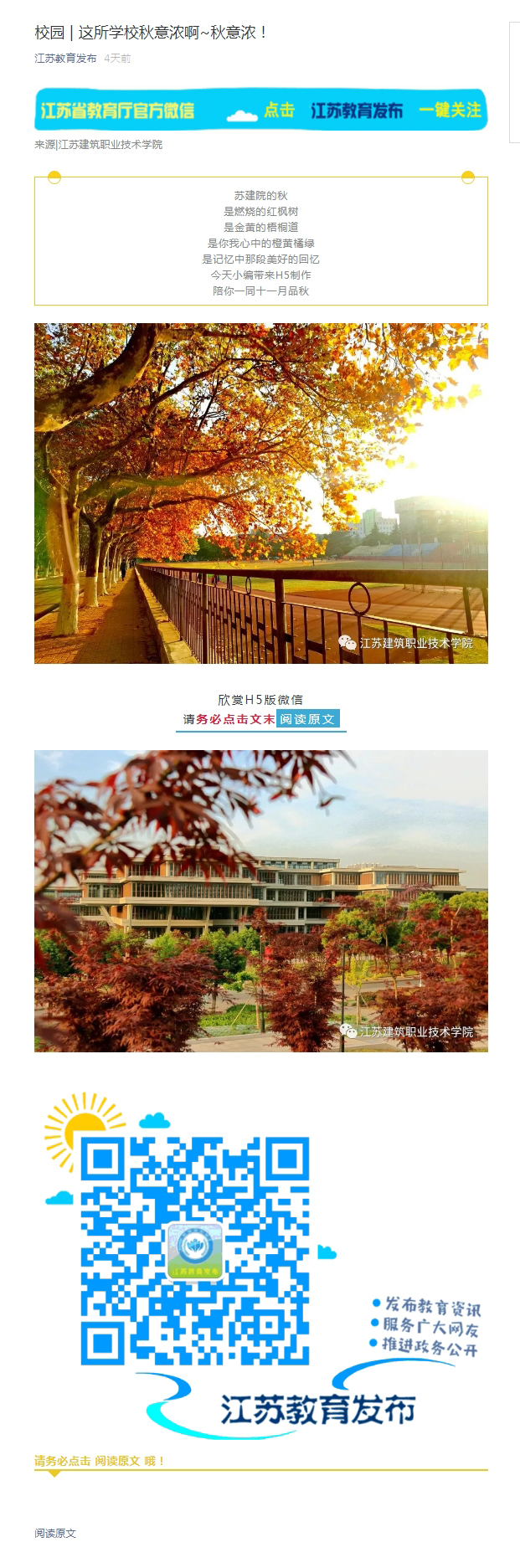 11月29日,江苏教育发布微信公众平台推送了一篇题为《校园 | 这所学校秋意浓啊~秋意浓!》的报道,点赞我校秋景盛况。