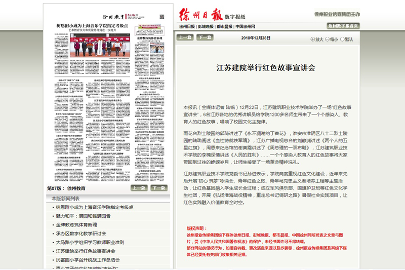 本报讯(全媒体记者 陆铭)12月22日,江苏建筑职业技术学院举办了一场“红色故事宣讲会”,6名江苏各地的优秀讲解员给学院1200多名师生带来了一个个感染人、教育人的红色故事,唱响了校园文化主旋律。