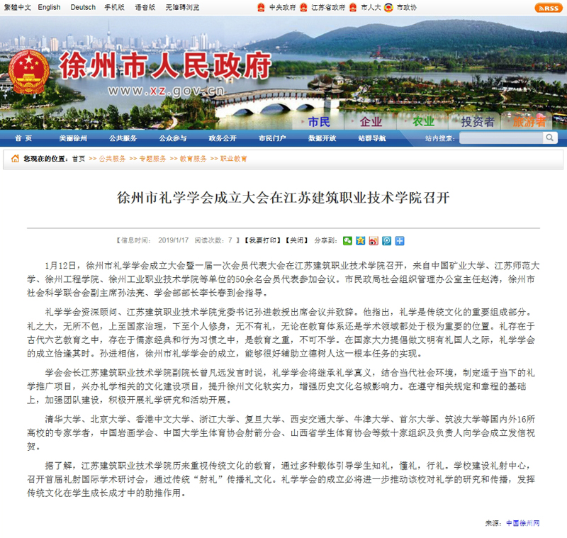 据了解,江苏建筑职业技术学院历来重视传统文化的教育,通过多种载体引导学生知礼,懂礼,行礼。学校建设礼射中心,召开首届礼射国际学术研讨会,通过传统“射礼”传播礼文化。礼学学会的成立必将进一步推动该校对礼学的研究和传播,发挥传统文化在学生成长成才中的助推作用。