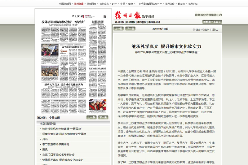 据了解,江苏建筑职业技术学院历来重视传统文化的教育,通过多种载体引导学生知礼,懂礼,行礼。学校建设礼射中心,召开首届礼射国际学术研讨会,通过传统“射礼”传播礼文化。礼学学会的成立必将进一步推动该校对礼学的研究和传播,发挥传统文化在学生成长成才中的助推作用。