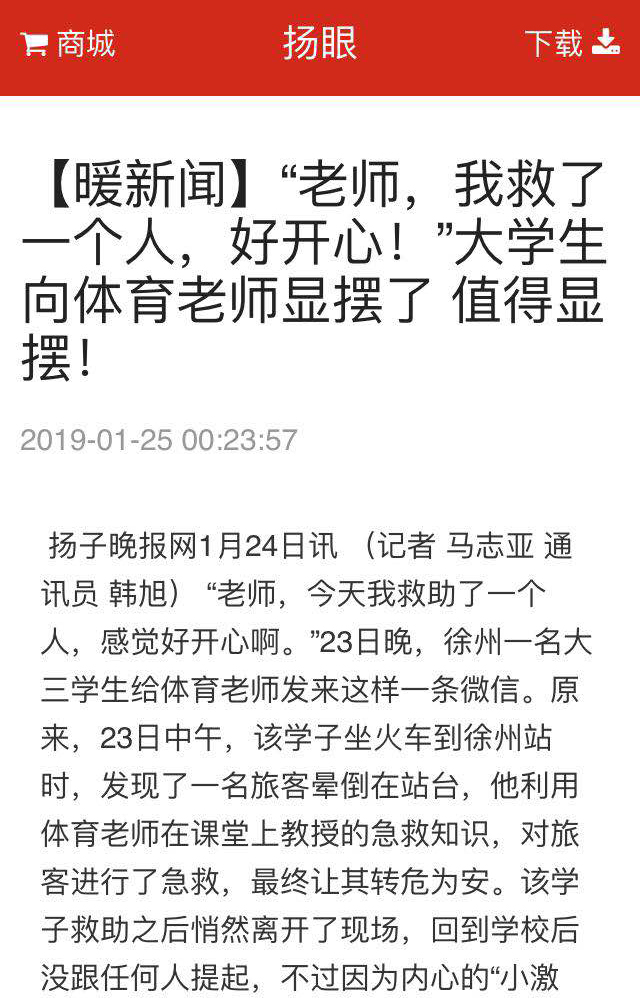 扬子晚报网1月24日讯(记者马志亚通讯员韩旭)“老师,今天我救助了一个人,感觉好开心啊。”23日晚,徐州一名大三学生给体育老师发来这样一条微信。原来,23日中午,该学子坐火车到徐州站时,发现了一名旅客晕倒在站台,他利用体育老师在课堂上教授的急救知识,对旅客进行了急救,最终让其转危为安。该学子救助之后悄然离开了现场,回到学校后没跟任何人提起,不过因为内心的“小激动”,他忍不住给体育老师发去了微信,分享自己救人后的快乐。