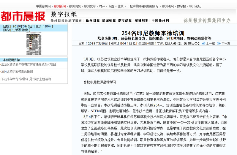 据悉,印尼高校教师海外培训项目(江苏)是一项印尼教育与文化部全额资助的培训项目,江苏建筑职业技术学院作为本次培训的中方联络单位和主要承办单位,中国矿业大学和江苏师范大学也分别承担一些项目。本次培训活动为期三周,参训人数254人,培训范围涵盖高校校长领导力培训、纺织服装、STEM项目、影视动画制作、信息技术应用、非正规教育教职员工管理等多项内容。