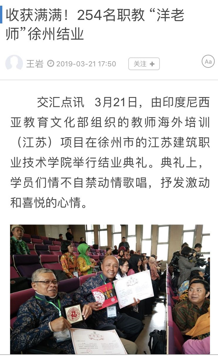 “江苏是中国的经济强省,也是教育强省,印尼和江苏有着广泛的经济合作,所以把江苏作为此次培训的首选之地。”印尼教育文化部教师与人事司行政处处长恩铛说,此次在江苏建院开展培训,用好了学校国际化办学的经验,计划进行长期合作。