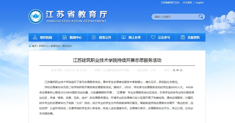 江苏建筑职业技术学院组织了系列志愿服务活动,青年学生志愿者在服务中奉献爱心,增长见识,承担起社会责任。