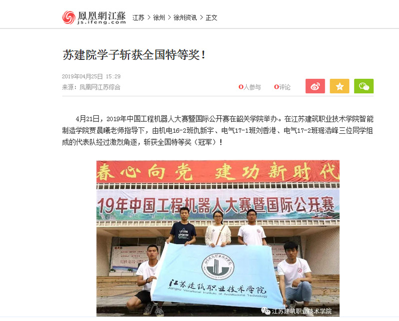 4月21日,2019年中国工程机器人大赛暨国际公开赛在韶关学院举办。在江苏建筑职业技术学院智能制造学院贾晨曦老师指导下,由机电16-2班仇新宇、电气17-1班刘香港、电气17-2班琚浩峰三位同学组成的代表队经过激烈角逐,斩获全国特等奖(冠军)!