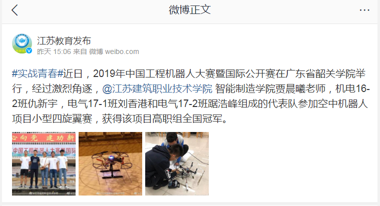 #实战青春#近日,2019年中国工程机器人大赛暨国际公开赛在广东省韶关学院举行,经过激烈角逐,@江苏建筑职业技术学院智能制造学院贾晨曦老师,机电16-2班仇新宇,电气17-1班刘香港和电气17-2班踞浩峰组成的代表队参加空中机器人项目小型四旋翼赛,获得该项目高职组全国冠军。