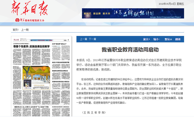 9日,2019年江苏省暨徐州市职业教育活动周启动仪式在江苏建筑职业技术学院举行。活动由省教育厅等11个部门共同举办,我省将开展一系列活动,全方位展示职业教育取得的新成果、新成就。