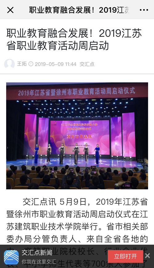 5月9日,2019年江苏省暨徐州市职业教育活动周启动仪式在江苏建筑职业技术学院举行。省市相关部委办局分管负责人、来自全省各地的中、高等职业院校校长、行业企业代表、中小学师生代表等700余人参加了启动仪式。