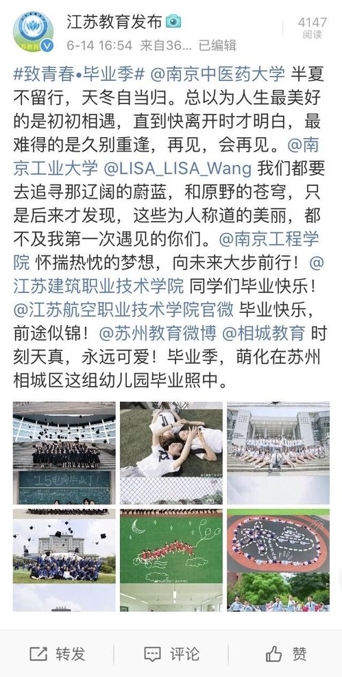 #致青春•毕业季#@南京中医药大学半夏不留行,天冬自当归。总以为人生最美好的是初初相遇,直到快离开时才明白,最难得的是久别重逢,再见,会再见。@南京工业大学@LISA_LISA_Wang我们都要去追寻那辽阔的蔚蓝,和原野的苍穹,只是后来才发现,这些为人称道的美丽,都不及我第一次遇见的你们。@南京工程学院怀揣热忱的梦想,向未来大步前行!@江苏建筑职业技术学院同学们毕业快乐!@江苏航空职业技术学院官微毕业快乐,前途似锦!@苏州教育微博@相城教育时刻天真,永远可爱!毕业季,萌化在苏州相城区这组幼儿园毕业照中。