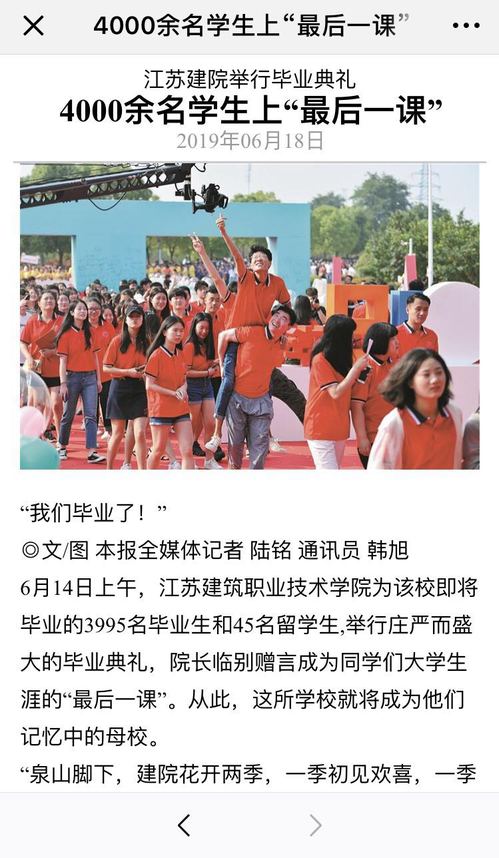6月14日上午,江苏建筑职业技术学院为该校即将毕业的3995名毕业生和45名留学生,举行庄严而盛大的毕业典礼,院长临别赠言成为同学们大学生涯的“最后一课”。从此,这所学校就将成为他们记忆中的母校。