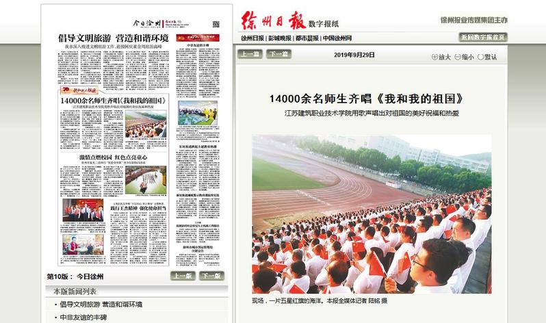 “今天,苏建院以青春之名为祖国点赞;今天,苏建院向祖国献上最深情的告白;今天,苏建院五星闪耀、师生别样‘红’。”江苏建筑职业技术学院党委书记孙进在接受记者采访时表示,苏建院全体师生员工相聚一起,在新中国成立70周年之际,以江苏建院人特有的红色情怀点亮爱国情,庆祝新中国70华诞。这是一堂别开生面的爱国主义思政课,大大激发了广大师生的爱国情、报国志。