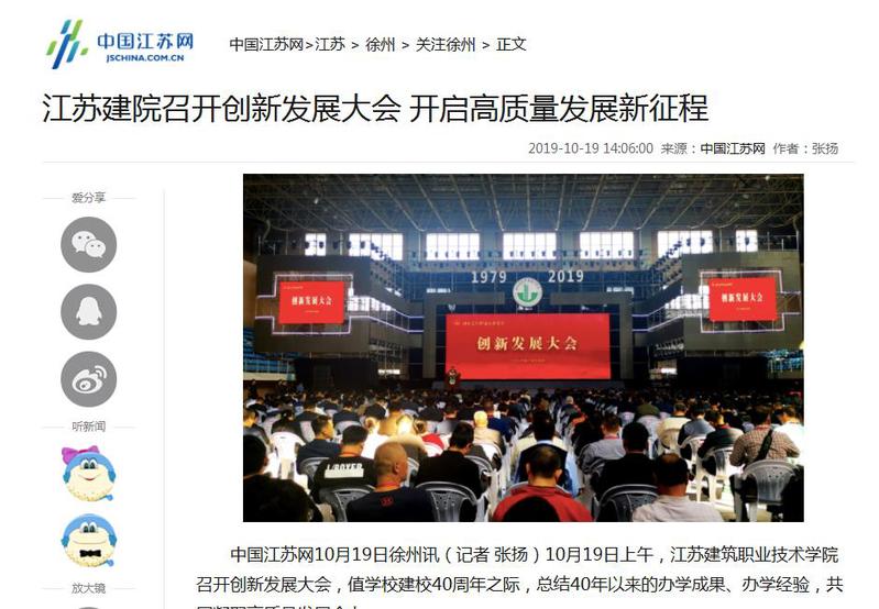 中国江苏网10月19日徐州讯(记者 张扬)10月19日上午,江苏建筑职业技术学院召开创新发展大会,值学校建校40周年之际,总结40年以来的办学成果、办学经验,共同凝聚高质量发展合力。