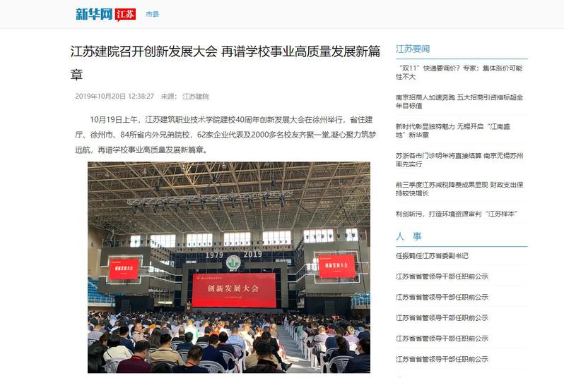 10月19日上午,江苏建筑职业技术学院建校40周年创新发展大会在徐州举行,省住建厅、徐州市、84所省内外兄弟院校,62家企业代表及2000多名校友齐聚一堂,凝心聚力筑梦远航,再谱学校事业高质量发展新篇章。