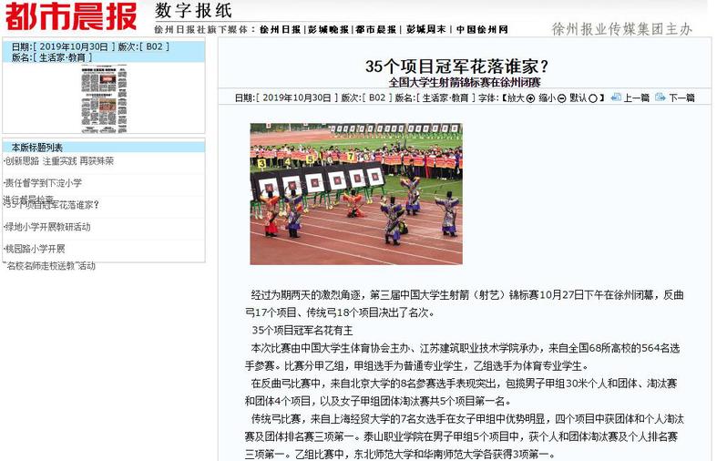 中华传统体育项目进校园,将优秀的民族传统文化进行创造性转化、创新性发展是高校“以文化人”的重要依托。近年来,江苏建院先后成立射艺队、建立礼射场、举办亚洲首届礼射研讨会、筹建礼射展览馆,将传统文化融入校园文化建设,将传统体育文化融汇到学生教育培养中,用“射以观德”的民族传统培育新时代精益求精的“大国工匠”。