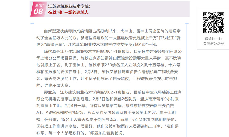 自新型冠状病毒肺炎疫情阻击战打响以来,火神山、雷神山两座医院的建设牵动了全国亿万人民的心。参与医院建设的一大批建设者更是被上千万“在线监工”赞许为“基建狂魔”。江苏建筑职业技术学院三位校友投身到战“疫”一线。