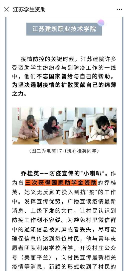 疫情防控的关键时候,江苏建院许多受资助学生纷纷参与到防疫工作的一线中,他们不忘国家曾给与自己的帮助,为坚决遏制疫情的扩散贡献自己的绵薄之力。