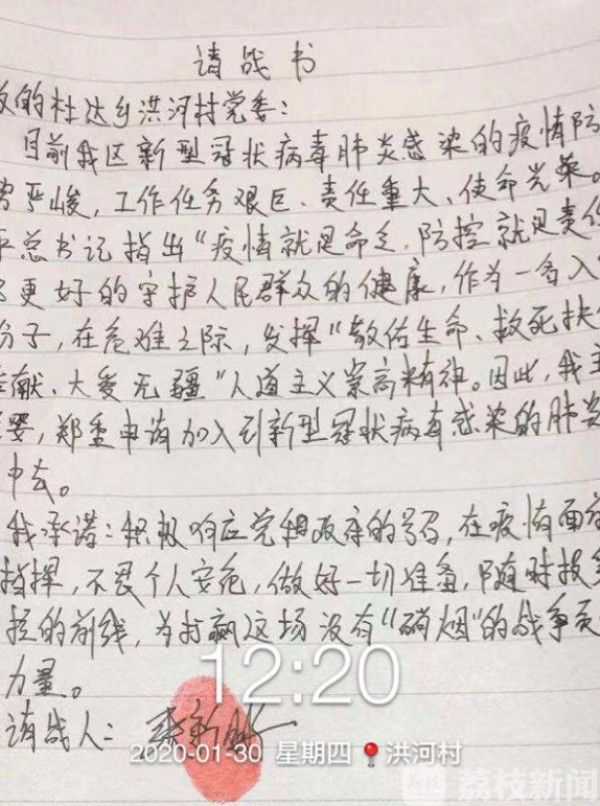 张新鹏同学曾获国家助学金资助,在疫情爆发后,他写下请战书,自2月1日开始,在黑龙江省齐齐哈尔市富拉尔基区洪河村参与社区疫情防控工作,每天早上7:00到下午5:00站岗巡查过往车辆、人流、监测体温;晚上8:30到11:00开始巡查社区街道,检查居民有无聚众集会、赌博等违法行为。他说,困难面前总有人站出来成为中国的脊梁,希望自己能成为这样的人。