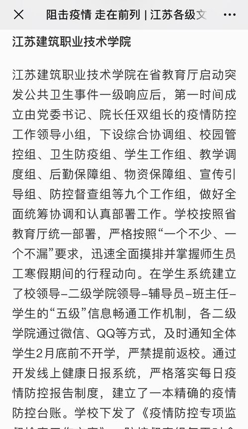 江苏建筑职业技术学院在省教育厅启动突发公共卫生事件一级响应后,第一时间成立由党委书记、院长任双组长的疫情防控工作领导小组,下设综合协调组、校园管控组、卫生防疫组、学生工作组、教学调度组、后勤保障组、物资保障组、宣传引导组、防控督查组等九个工作组,做好全面统筹协调和认真部署工作。学校按照省教育厅统一部署,严格按照“一个不少、一个不漏”要求,迅速全面摸排并掌握师生员工寒假期间的行程动向。在学生系统建立了校领导-二级学院领导-辅导员-班主任-学生的“五级”信息畅通工作机制,各二级学院通过微信、QQ等方式,及时通知全体学生2月底前不开学,严禁提前返校。通过开发线上健康日报系统,严格落实每日疫情防控报告制度,建立了一本精确的疫情防控台账。学校下发了《疫情防控专项监督检查工作方案》,防控督查组每天对全校防疫工作进展情况进行“四不两直”督查,以严而又严、细而又细、实而又实的举措,切实把疫情防控工作抓实抓细。学校党委组织全体中层干部轮班值守,展现了党员干部靠前指挥的责任担当。