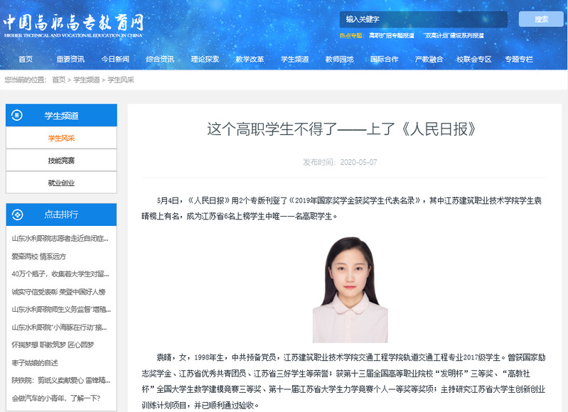 5月4日,《人民日报》用2个专版刊登了《2019年国家奖学金获奖学生代表名录》,其中江苏建筑职业技术学院学生袁晴榜上有名,成为江苏省6名上榜学生中唯一一名高职学生。