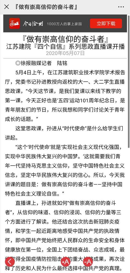 据了解,直播课“做有崇高信仰的奋斗者——坚持中国特色社会主义理论自信”是江苏建筑职业技术学院“四个自信”系列思政直播课的首课,之后还有赵炜教授直播的“文化自信:中华民族伟大复兴的强大精神支撑”,马克思主义学院院长崔宏利副教授直播的“道路自信是中国青年成长发展的根基”,张文远副教授直播的“制度自信的理由和底气”。