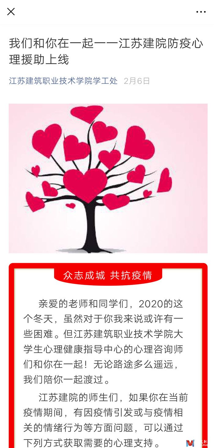 为了缓解学生疫情期间可能出现的焦虑、压抑等心理状况,学校及时组织开通了网络心理援助服务,综合应用心理危机干预技术,面向全校师生开通了24小时网络心理援助服务,为学生撑起了心理“保护伞”,做好学生的心理守护者,帮助学生能够在家安心学习、健康生活。