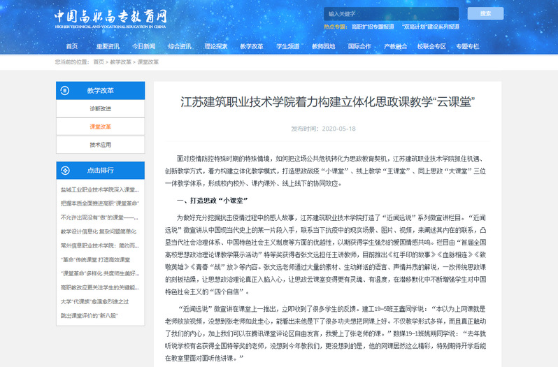 面对疫情防控特殊时期的特殊情境,如何把这场公共危机转化为思政教育契机,江苏建筑职业技术学院抓住机遇、创新教学方式,着力构建立体化教学模式,打造思政战疫“小课堂”、线上教学“主课堂”、同上思政“大课堂”三位一体教学体系,形成校内校外、课内课外、线上线下的协同效应。