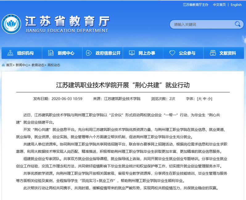 开发“荆心共建”就业信息平台。充分利用江苏建筑职业技术学院优质资源力量,与荆州理工职业学院在就业信息、就业渠道、就业指导、就业资源、创业实践、就业管理等六个方面建立帮扶机制,促进荆州理工职业学院毕业生充分就业。