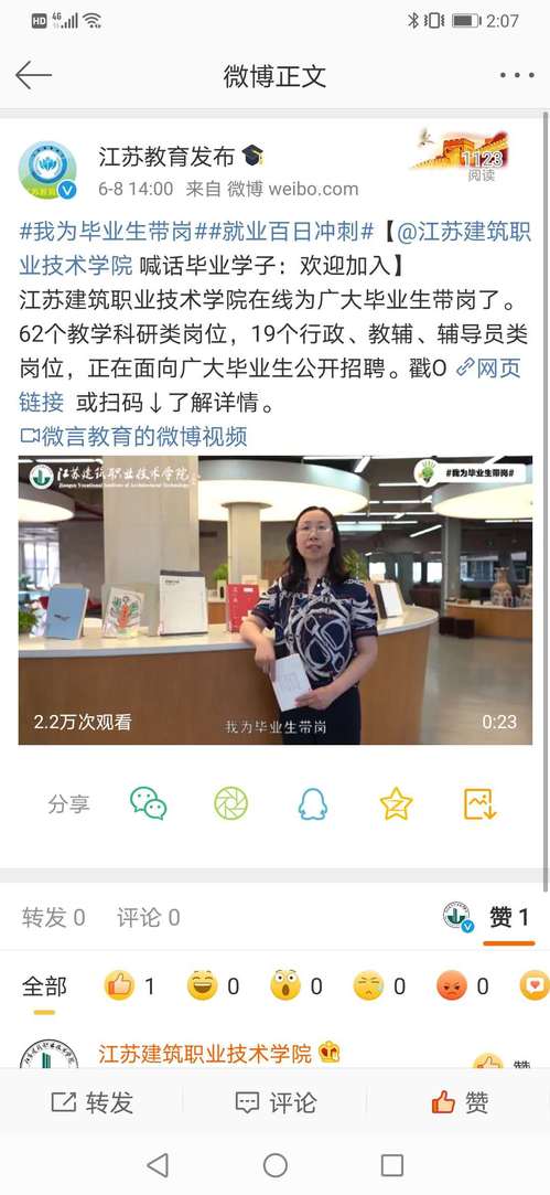 #我为毕业生带岗##就业百日冲刺#【@江苏建筑职业技术学院 喊话毕业学子:欢迎加入】江苏建筑职业技术学院在线为广大毕业生带岗了。62个教学科研类岗位,19个行政、教辅、辅导员类岗位,正在面向广大毕业生公开招聘。
