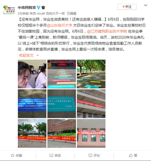 【没有毕业照,毕业生泪奔离校!还有这些感人横幅...】6月8日,在刚刚回归学校仅短短半个多月@山东临沂大学 大四毕业生们迎来了毕业。毕业生在离校时忍不住泪撒校园,因为没有毕业照。6月6日,@江苏建筑职业技术学院 在毕业季“最后一课”上离别前,教师哽咽,毕业生现场落泪。当天,该校2020年毕业典礼以“线上+线下”相结合的形式举行,毕业生代表现场给物业食堂后勤工作人员献花,多媒体教室同步直播,毕业生同上最后一次班会课,泪目难忘。