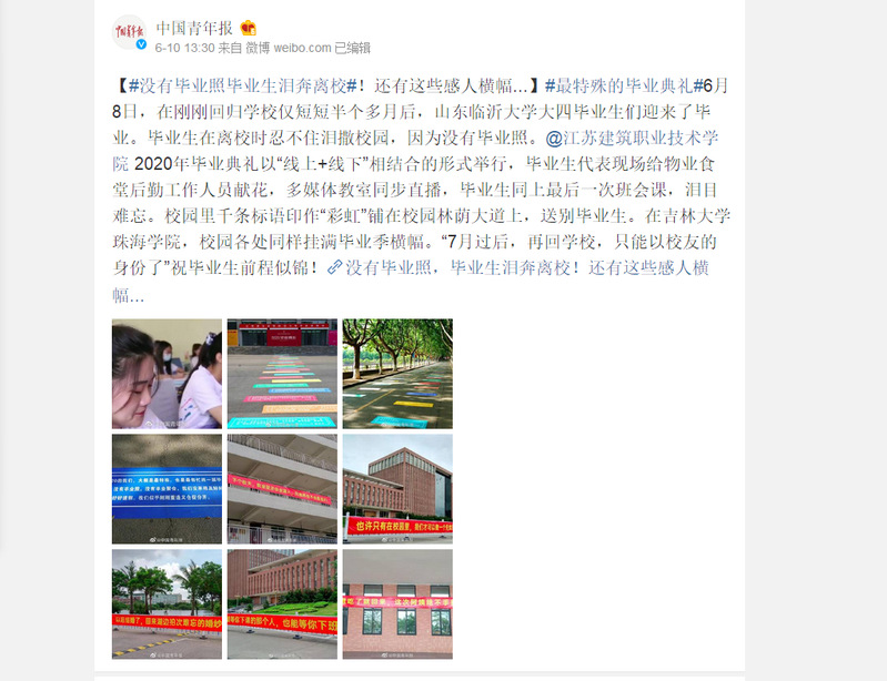 【#没有毕业照毕业生泪奔离校#!还有这些感人横幅...】#最特殊的毕业典礼#6月8日,在刚刚回归学校仅短短半个多月后,山东临沂大学大四毕业生们迎来了毕业。毕业生在离校时忍不住泪撒校园,因为没有毕业照。@江苏建筑职业技术学院 2020年毕业典礼以“线上+线下”相结合的形式举行,毕业生代表现场给物业食堂后勤工作人员献花,多媒体教室同步直播,毕业生同上最后一次班会课,泪目难忘。校园里千条标语印作“彩虹”铺在校园林荫大道上,送别毕业生。在吉林大学珠海学院,校园各处同样挂满毕业季横幅。“7月过后,再回学校,只能以校友的身份了”祝毕业生前程似锦!