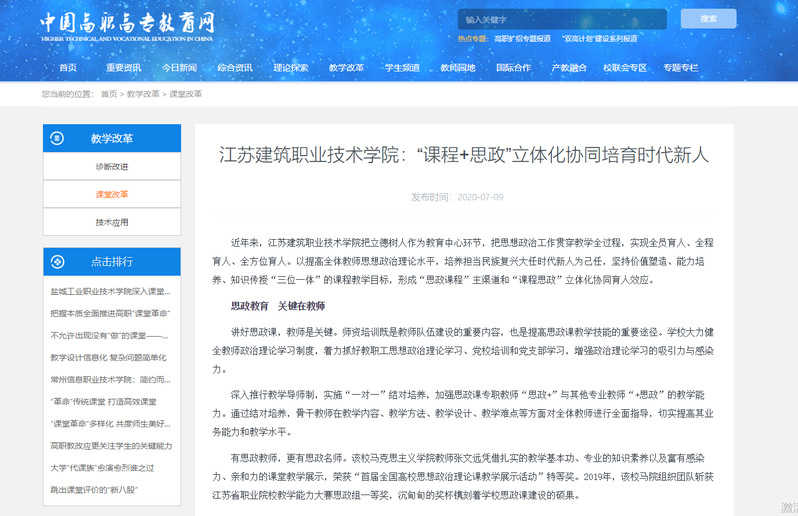 近年来,江苏建筑职业技术学院把立德树人作为教育中心环节,把思想政治工作贯穿教学全过程,实现全员育人、全程育人、全方位育人。以提高全体教师思想政治理论水平,培养担当民族复兴大任时代新人为己任,坚持价值塑造、能力培养、知识传授“三位一体”的课程教学目标,形成“思政课程”主渠道和“课程思政”立体化协同育人效应。