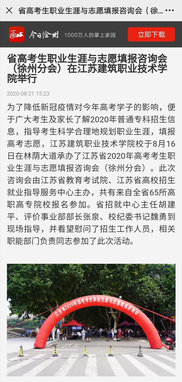 为了降低新冠肺炎疫情对今年高考学子的影响,便于广大考生及家长了解2020年普通专科招生信息,指导考生科学合理地规划职业生涯,填报高考志愿,江苏建筑职业技术学院校于8月16日在林荫大道承办了江苏省2020年高考考生职业生涯与志愿填报咨询会(徐州分会)。此次咨询会由江苏省教育考试院、江苏省高校招生就业指导服务中心主办,共有来自全省65所高职高专院校报名参加。省招就中心主任胡建平、评价事业部部长张泉、校纪委书记魏勇到现场指导,并看望慰问了招生工作人员,相关职能部门负责同志参加了此次活动。