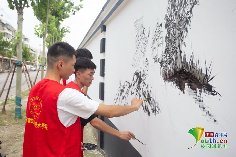 图为美丽乡绘实践团正在文化墙上手绘中国青年网通讯员 张世豪 摄