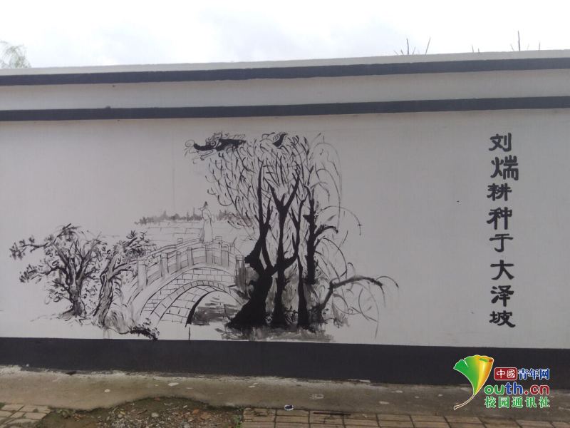实践团成员运用自己的艺术技能——手绘,以汉高祖刘邦的经历为线索,在长达300米的文化墙上,通过讲故事的方式,绘制出十八幅“五门传奇”故事。五门出逃、斩蛇起义、垓下之战、刘邦称帝等等都是居民耳熟能详的经典历史故事,通过一幅幅水墨画的中国风形式展现刘邦传奇的一生。美化了街道的同时又彰显了丰县悠久的历史文化,提升丰县人民的自豪感和生活的幸福感,成为丰县精神文明有一块新的文化标地。