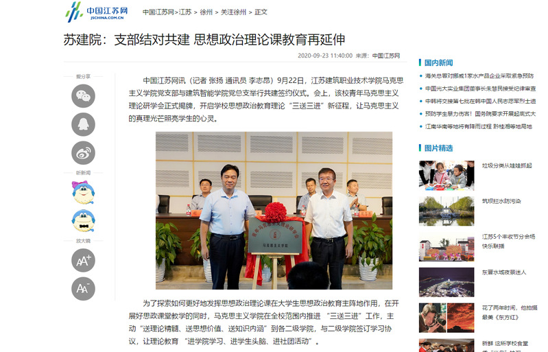 中国江苏网讯(记者 张扬 通讯员 李志昂)9月22日,江苏建筑职业技术学院马克思主义学院党支部与建筑智能学院党总支举行共建签约仪式。会上,该校青年马克思主义理论研学会正式揭牌,开启学校思想政治教育理论“三送三进”新征程,让马克思主义的真理光芒照亮学生的心灵。