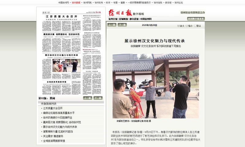 本报讯(徐报融媒记者 张瑾)9月25日下午,身着汉代服饰的数位媒体人在江苏建筑职业技术学院的射艺场进行了射艺体验和汉礼学习。此为徐报融媒“汉文化在徐州”系列探访报道活动之一,市礼学学会秘书长韩冰雪和江苏建院校队的5位箭手给大家作了细心规范的演示。