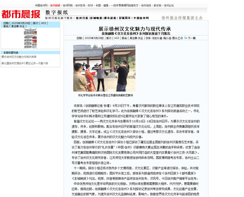 十一期间,探访小组还将对我市多个文博场馆、汉文化景区、汉服产业等进行探访、体验,并对前期采访、视频进行后期制作。国庆节长假之后,报纸系列报道将陆续在《徐州日报》《都市晨报》《彭城晚报》刊出,视频、抖音等新媒体产品将在徐州发布、汉风号、今日徐州客户端等平台发布。