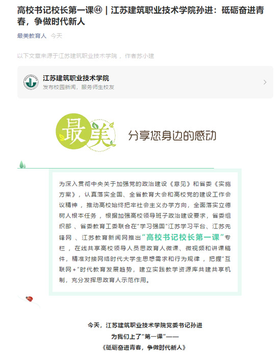 各位同学,你们的到来,为蓬勃发展的江苏建院注入了新鲜血液。看到你们青春洋溢的面孔,感受你们拼搏奋进的朝气,让身为教师的我们更加深刻体会到了“得天下英才而育之”的快乐与幸福。作为师长,我有几点建议与大家共勉。