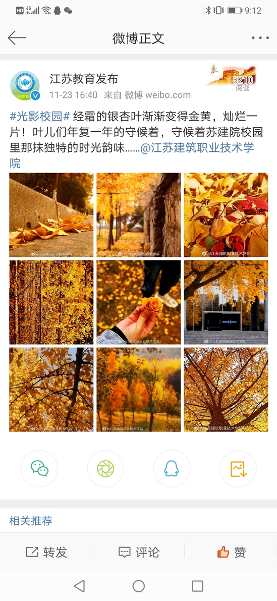 #光影校园# 经霜的银杏叶渐渐变得金黄,灿烂一片!叶儿们年复一年的守候着,守候着苏建院校园里那抹独特的时光韵味……@江苏建筑职业技术学院