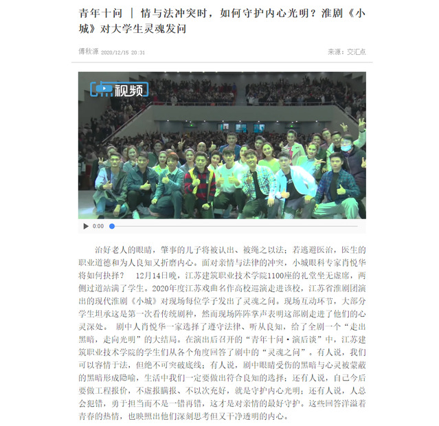 治好老人的眼睛,肇事的儿子将被认出、被绳之以法;若逃避医治,医生的职业道德和为人良知又折磨内心。面对亲情与法律的冲突,小城眼科专家肖悦华将如何抉择? 12月14日晚,江苏建筑职业技术学院1100座的礼堂坐无虚席,两侧过道站满了学生。2020年度江苏戏曲名作高校巡演走进该校,江苏省淮剧团演出的现代淮剧《小城》对现场每位学子发出了灵魂之问。现场互动环节,大部分学生坦承这是第一次看传统剧种,然而现场阵阵掌声表明这部剧走进了他们的心灵深处。 剧中人肖悦华一家选择了遵守法律、听从良知,给了全剧一个“走出黑暗,走向光明”的大结局。在演出后召开的“青年十问·演后谈”中,江苏建筑职业技术学院的学生们从各个角度回答了剧中的“灵魂之问”。有人说,我们可以容情于法,但绝不可突破底线;有人说,剧中眼睛受伤的黑暗与心灵被蒙蔽的黑暗形成隐喻,生活中我们一定要做出符合良知的选择;还有人说,自己今后要做工程报价,不虚报瞒报、不以次充好,就是守护内心光明;还有人说,人总会犯错,勇于担当而不是一错再错,这才是对亲情的最好守护。这些回答洋溢着青春的热情,也映照出他们深刻思考但又干净透明的内心。